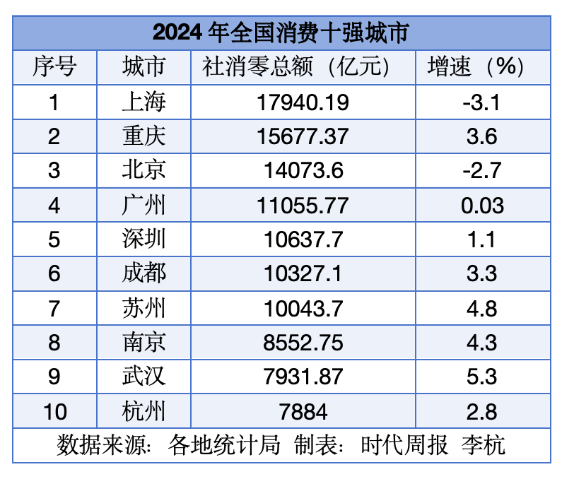 2024年,我国消费十强城市中,除去7个已经突破万亿的(上海、重庆、北京、广州、深圳、成都和苏州),还剩下南京、武汉、杭州三座城市等待“冲刺”万亿大关。